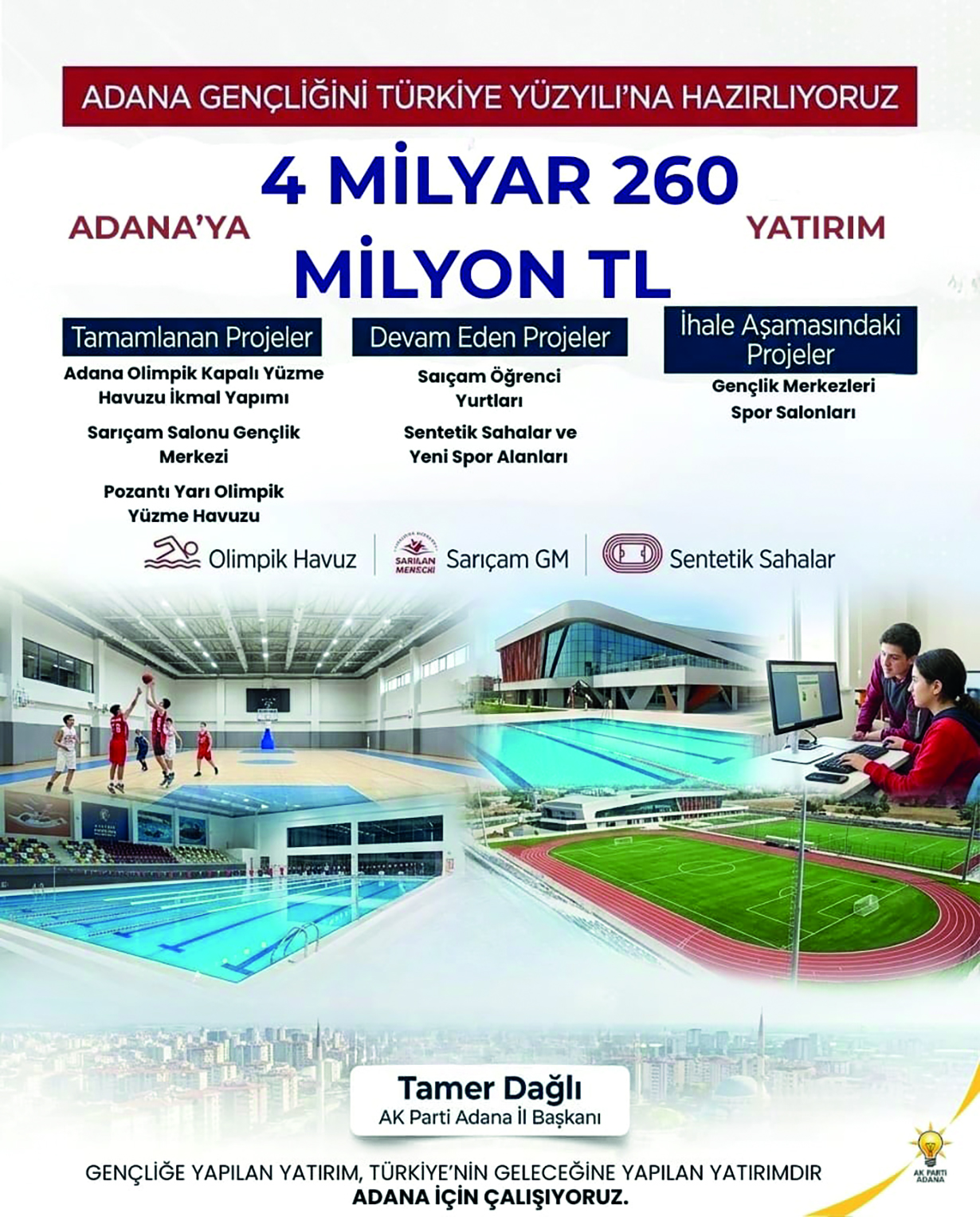 “Gençliğe yapılan yatırım, Türkiye’nin geleceğine yapılan yatırımdır. Cumhurbaşkanımız Sayın Recep Tayyip Erdoğan’ın liderliğinde Türkiye Yüzyılı’nı inşa ederken, güçlü şehirler ve donanımlı bir gençlik hedefiyle çalışıyoruz. 4 milyar 260 milyon TL’yi aşkın dev yatırım hamlesi, Adana’mızın yarınlarına duyduğumuz inancın en somut göstergesidir.”